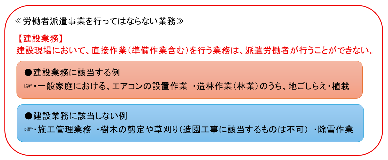 ただし、派遣が禁止される業務は建設工事の現場において、直接これらの作業に従事するものに限られますので、例えば、建設現場の事務職員が行う業務は、事務作業のみに従事している限りにおいては派遣禁止業務ということにはなりません。