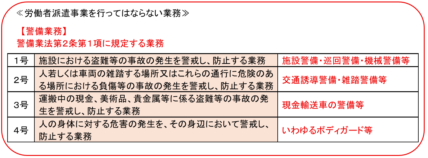 また、派遣労働者が従事する業務の一部に、警備業法第2条第1項に規定する業務のうちいずれかの業務が含まれているときは、全体として違法な労働者派遣となりますのでご注意ください。
