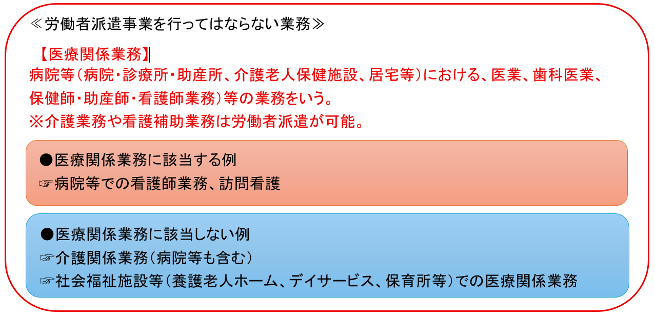 禁止されるのは、病院等(病院・診療所・助産所、介護老人保健施設、居宅等)における、医業、歯科医業、保健師・助産師・看護師業務)等の業務が該当します。
